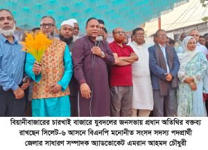 আসন্ন ত্রয়োদশ জাতীয় নির্বাচনে সিলেট-৬ আসনে বিএনপি মনোনীত সংসদ সদস্য পদপ্রার্থী জেলার সাধারণ সম্পাদক এডভোকেট এমরান আহমদ চৌধুরী বলেছেন- গোলাপগঞ্জ-বিয়ানীবাজারর সব এলাকার ছোট-বড় সমস্যা আমার কাছে চিহ্নিত। আগামী দিনের জন্য আপনারা আমাকে মহান সংসদে পাঠালে সেখানে গলা ফাটিয়ে আপনাদের দাবিগুলো তুলে ধরবো এবং সমাধানের জোর প্রচেষ্টা চালাবো।