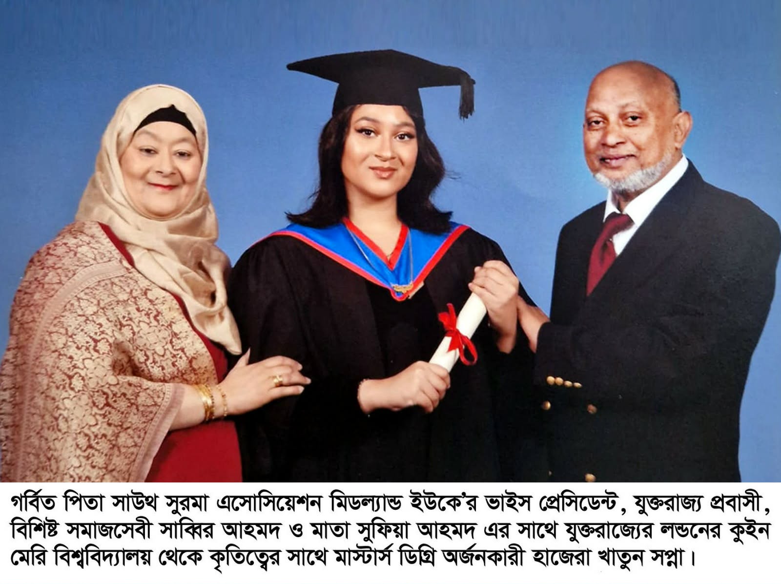 যুক্তরাজ্যের লন্ডনের কুইন মেরি বিশ্ববিদ্যালয় থেকে কৃতিত্বের সাথে মাস্টার্স ডিগ্রি অর্জন করেছে কভেন্ট্রিতে স্বপরিবারে বসবাসরত সিলেটের হাজেরা খাতুন সপ্না। সে সাউথ সুরমা এসোসিয়েশন মিডল্যান্ড ইউকে’র ভাইস প্রেসিডেন্ট, যুক্তরাজ্য প্রবাসী, বিশিষ্ট সমাজসেবী সাব্বির আহমদ ও সুফিয়া আহমদের মেয়ে।